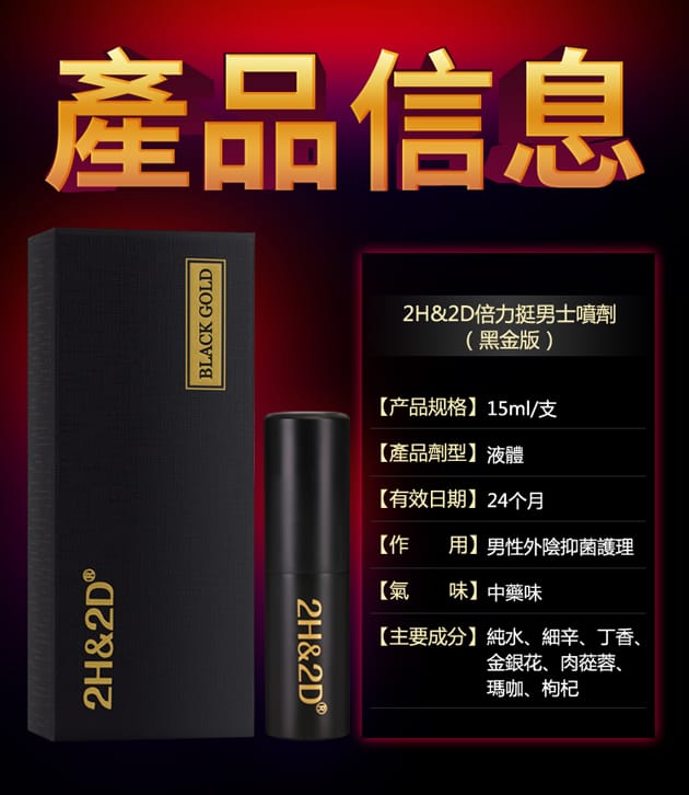日本丸榮2h2d 是一款男性外用延時噴劑,為純草本提取,使用後不會產生麻木、燒灼等任何不適感受,通過了日本厚生省藥務局、日本食品分析檢測中心和歐美多家權威機構的檢測,可安全使用。日本2h2d持久液作用機理主要是丁香植物透皮系統將紫霄花及其它活性成分滲入陰莖體內部,紫霄花為骨針結構,可刺激陰莖體,加速血液循環,延長勃起時間,有效控制治療早泄癥狀。