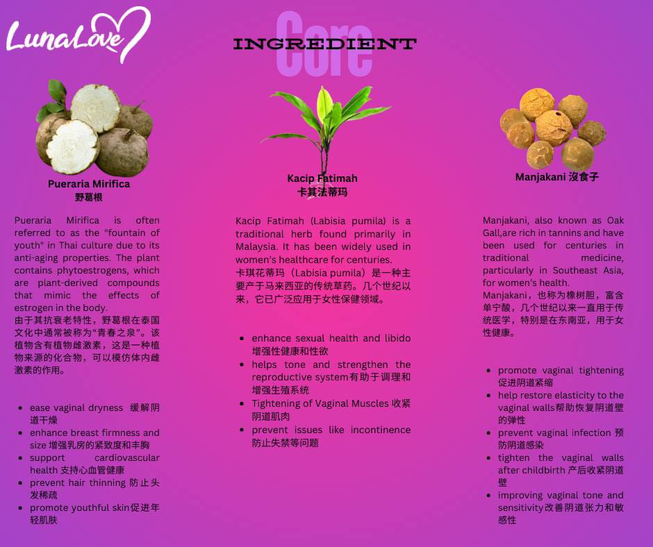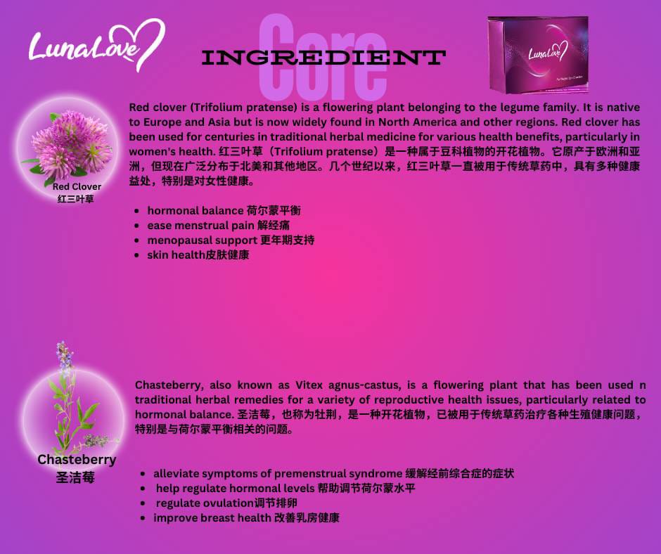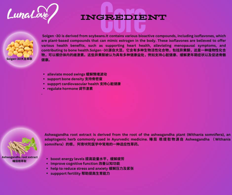 主要成分:覆盆子、紅三葉草、蔓越莓、接骨木漿果、圣洁莓、卡其法蒂玛、野葛根、藏红花、叶酸等提取物