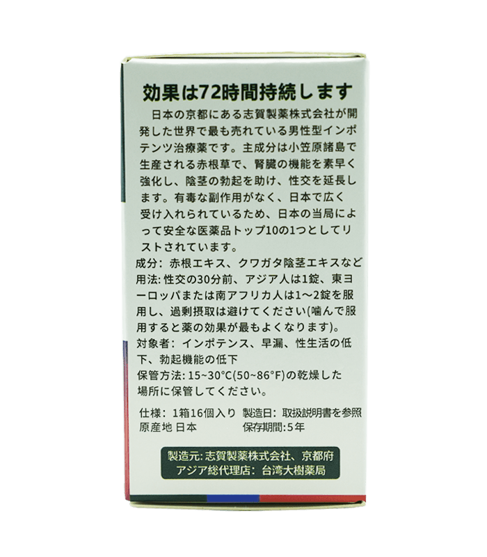 | 藤本日本 | 赤根草浸膏、雄鹿鞭浸膏、澱粉等 | 男性功能障礙、腎虛、體弱缺少精力、房事易疲勞者、時間極短者 | 全球多家臨床認證,有效率達到98%。 | 純植物完全沒有任何副作用,適合20到60歲年齡之間使用。 |